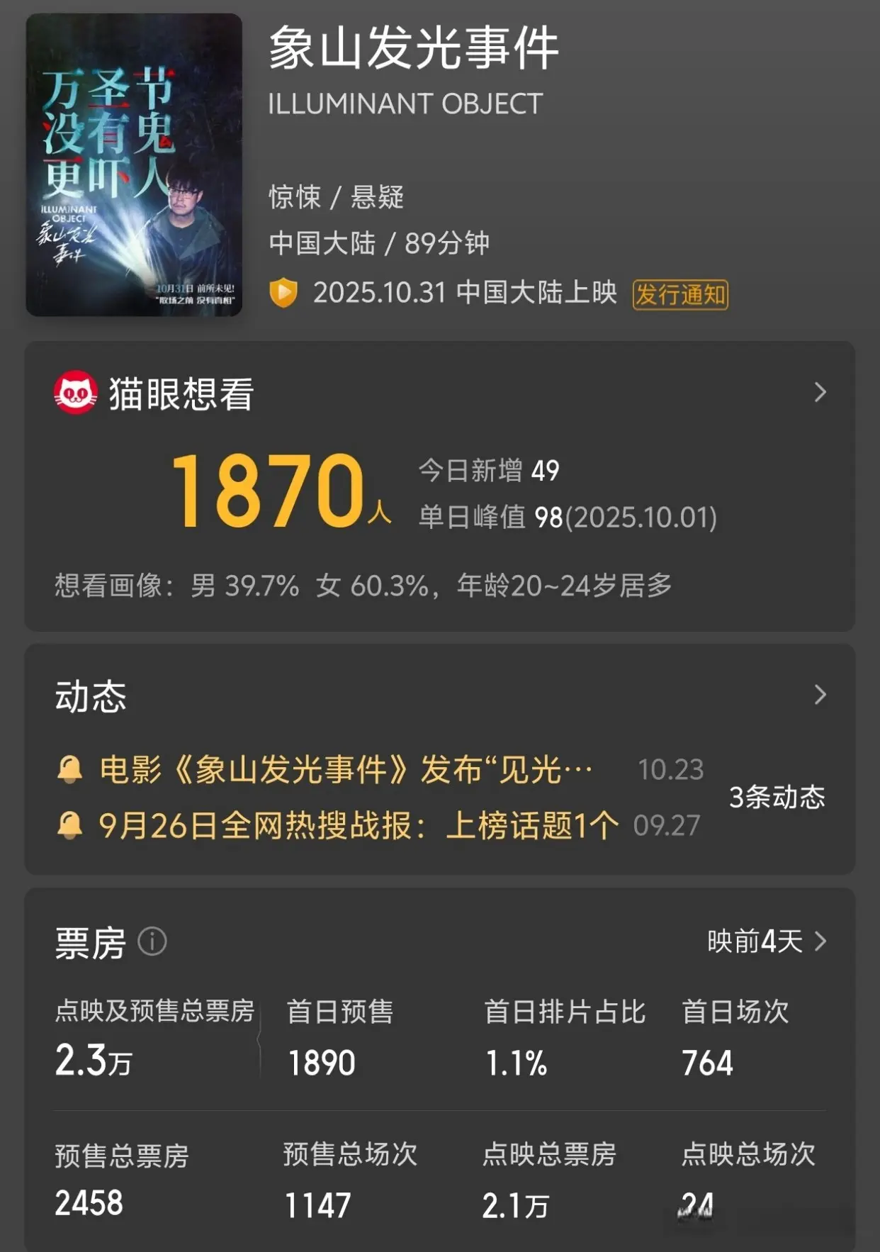 故而《象山发光事件》的预售票房之所以如此尴尬,套路老只是一个比较小的因素,更多的原因是在于其观众群体比较少。