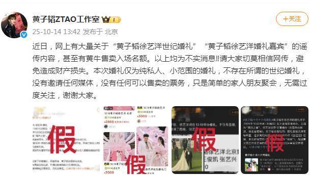 10月14日,黄子韬工作室微博发文回应称:“近日,网上有大量关于‘黄子韬徐艺洋世纪婚礼’‘黄子韬徐艺洋婚礼嘉宾’的谣传内容,甚至有黄牛售卖入场名额。以上均为不实消息!请大家切莫相信网传,避免造成财产损失。本次婚礼仅为纯私人、小范围的婚礼,不存在所谓的世纪婚礼,没有邀请任何媒体,没有任何可以售卖的票务。”